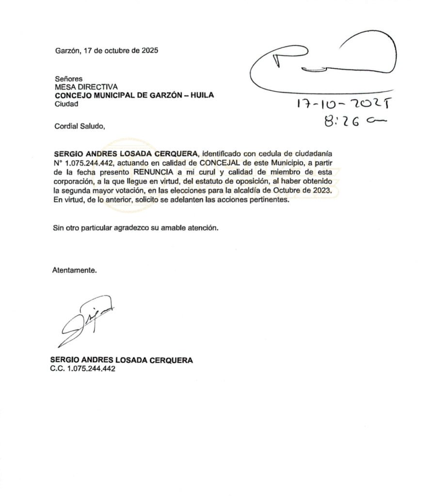 En las últimas horas, Sergio Andrés Losada Cerquera presentó formalmente su renuncia al cargo de concejal del municipio de Garzón, decisión que fue radicada ante la mesa directiva del Concejo Municipal.