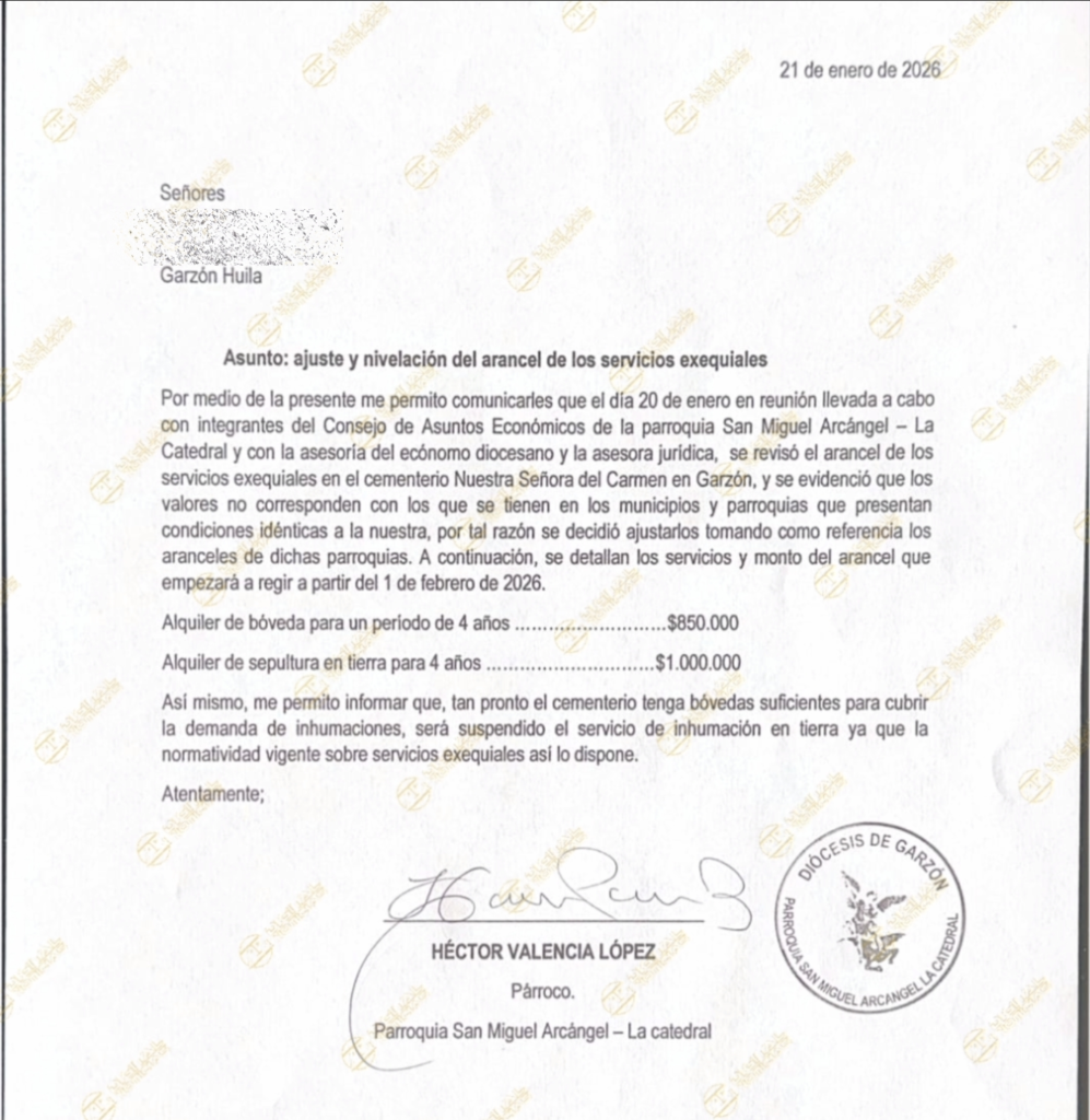 Con el propósito de actualizar y armonizar los costos de los servicios exequiales, la Parroquia San Miguel Arcángel – La Catedral informó sobre el ajuste y nivelación del arancel del Cementerio Nuestra Señora del Carmen, en el municipio de Garzón.